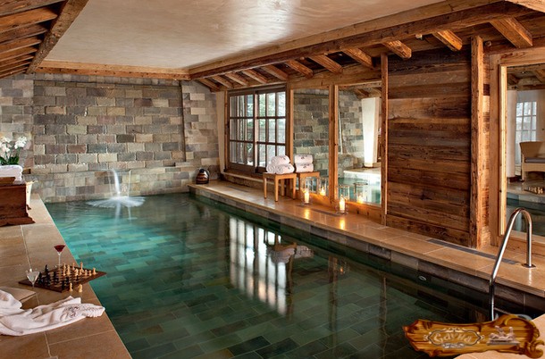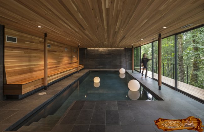 Керамическая плитка с фактурой деревянной поверхности свяжет отделку парилки и душевой с бассейном. Плитку пола темного цвета неплохо скомбинировать с похожей настенной плиткой. Лучше подбирать отделку из одной коллекции, чтобы весь комплекс смотрелся гармонично. Природные насыщенные тона не покажутся мрачными за счет большой площади оконных проемов. Простые прямоугольные конструкции приобретают стильный шарм.