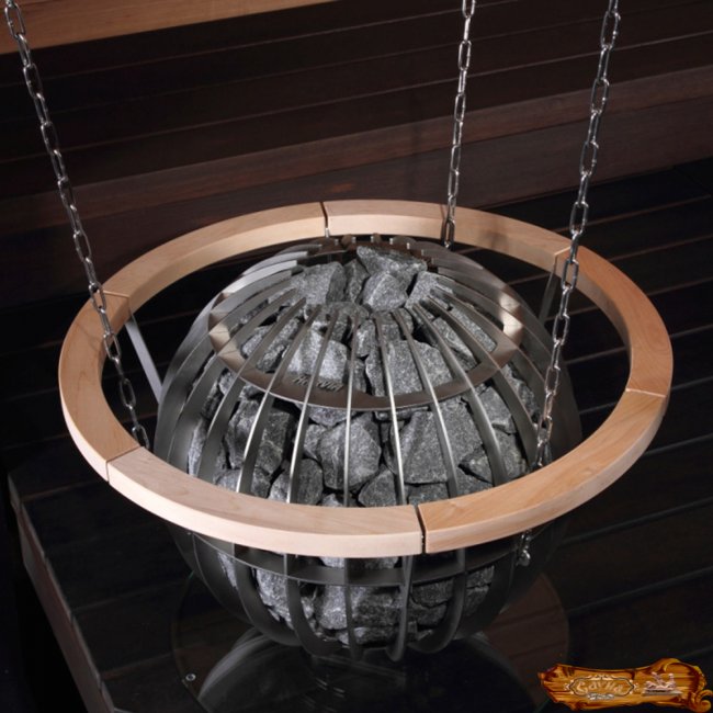 Оригинальная каменка в виде шара, подвешенного на цепи на фоне панно из натурального камня.