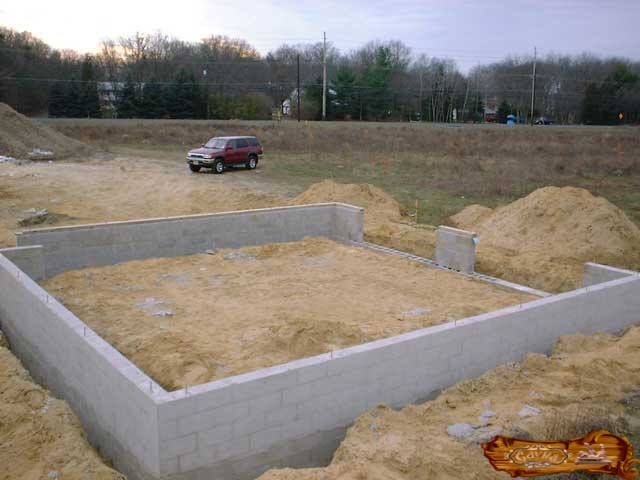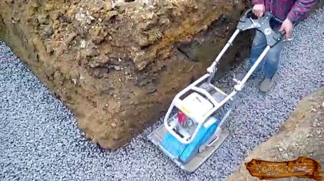 Стройка ленточного фундамента начинается с раскопки траншеи. После разметки и срезания верхнего слоя поверхность засыпают песчано-щебеночной подушкой. Перед засыпкой черновую поверхность необходимо утрамбовать при помощи вибрационных устройств. Для небольших зданий габаритами 4х6, 6х4, 5х5 метров не стоит проектировать глубокий фундамент. Достаточно будет подложки толщиной 300 миллиметров.