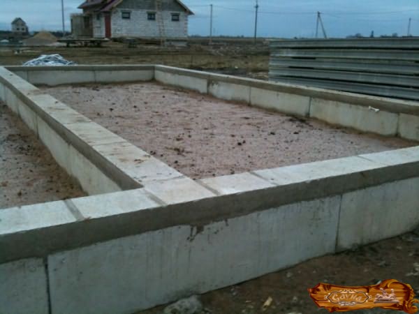 Ленточный фундамент из бетонных блоков подойдет для малогабаритной бани. Железобетон – тяжелый материал, поэтому большие фрагменты можно установить только с помощью строительной техники. Оптимальными считаются детали размером 20 на 40 сантиметров. Такие блоки устанавливают в шахматном порядке на песчаную подложку. Монтаж фундамента можно выполнить за два дня.