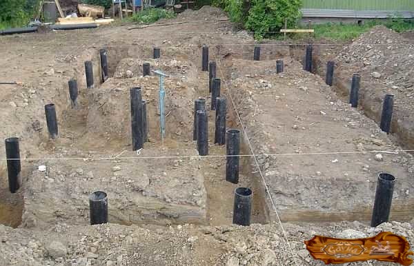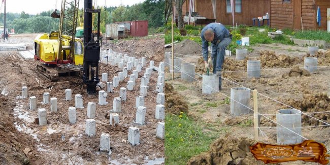 Земляные работы по устройству свайного или столбчатого основания начинаются с бурения скважин. Как и в случае с ленточным фундаментом, для свай необходимо выложить щебеночную подложку. Подушка обычно не превышает 250 миллиметров. Далее выкладывают столбы из бута или кирпича. В некоторых случаях в выработанные отверстия погружают аппарат, заполняющий скважину бетоном. Так получаются бетонные сваи.