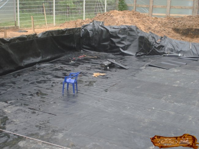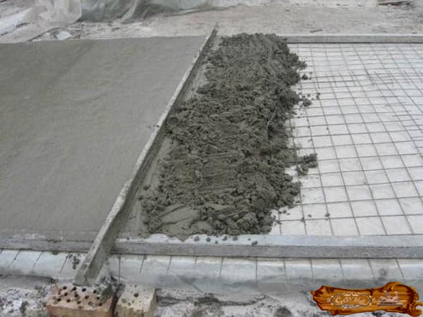 Начиная с краев, необходимо сделать ровную горизонтальную поверхность. Стены намного проще устанавливать на ровное основание. Щитки скрепляют гвоздями, а стыки промазывают грунтом. За точностью работ можно следить при помощи лазерного уровня. После опалубки на дно укладывают первый слой стяжки и погружают в него арматурный каркас. Весь объем опалубки необходимо заполнить цементом, разравнивая поверхность.