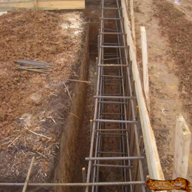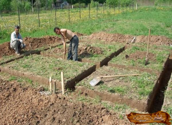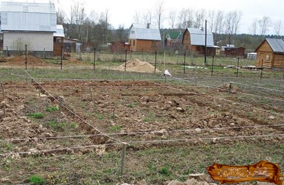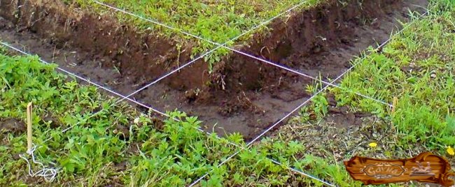 Как описано ранее, разметка проводится по составленной заранее схеме с учетами особенностей типа фундамента. Ход каната между колышек – разметка линий стен фундамента. После нанесения контуров необходимо разработать траншеи для прокладки фундамента. Глубина выработки зависит от свойств грунта и вида основания.