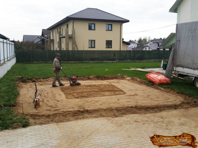 Толщина песочной засыпки варьируется от типа и свойств почвы. Если грунт водонасыщенный, то подложку следует увеличить до 40 сантиметров. Песчаный слой укладывается горизонтально, обильно смачивается водой и трамбуется. Большую подушку делят на слои толщиной 5-7 сантиметров и укладывают постепенно. После засыпки и уплотнения необходимо оставить покрытие на два или три дня до полного высыхания грунта.