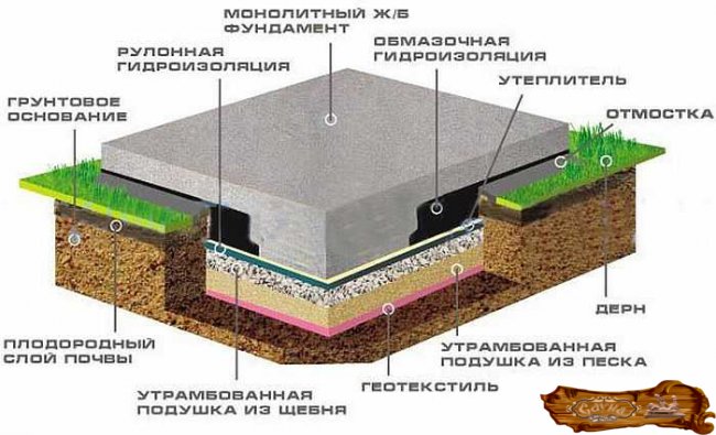 Монолитное основание представляет собой плиту, установленную на подложку из песка и щебня. Толщина подушки может достигать от двадцати до пятидесяти сантиметров в зависимости от типа грунта и особенностей сооружения. Фундамент может быть мелкозаглубленным и незаглубленным.