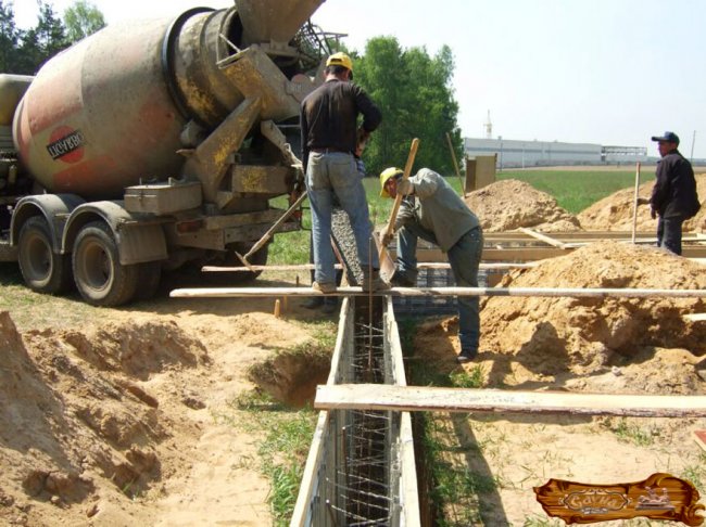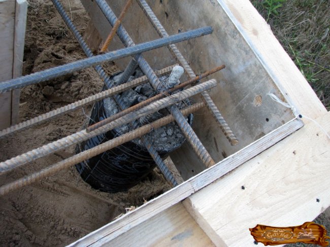 Опалубку выправляют, каркас должен быть ровным. От качества проделанной работы будет зависеть равномерность распределения массы сооружения по поверхности. Искривление конструкции приведет к неравномерной закладке грунта. Заливку бетон в опалубку производят, начиная с голов свай. Укрепление конструкции достигается путем заглубления опор в ростверк на небольшое расстояние.
