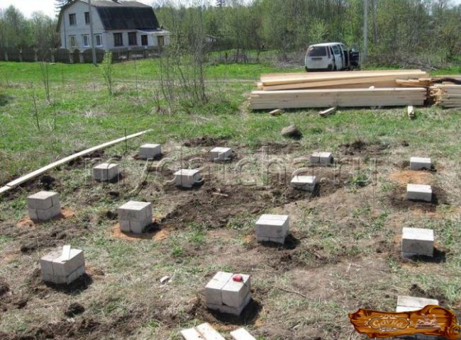 При устройстве свай колышками отмечают местоположение будущих скважин. Их количество зависит от площади бани. Шаг выработок не должен превышать двух метров. Сваи также необходимо располагать в местах сопряжения несущей стены с перегородками. Если этажность будущего здания достигнет два и более этажа, то расстояние между опорами необходимо уменьшить. Плотный грунт позволяет сократить количество свай, а сыпучий наоборот. Глубина скважины зависит от типа грунта: в пучинистой почве сваю необходимо опустить на 30-50 сантиметров ниже.