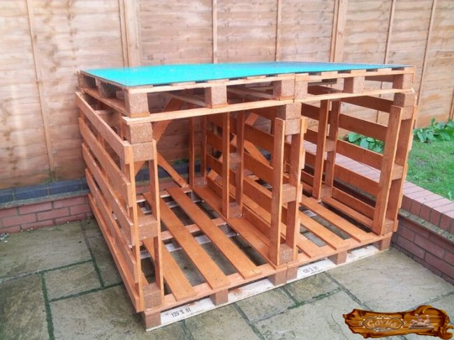 Покройте дерево лаком. Можно покрасить дровник краской и украсить декоративными конструкциями.
