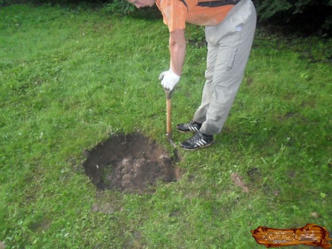 Определите и обозначьте территорию строительства на участке. Выкопайте 6 ямок под опоры – по 3 в передней и задней части. Размеры углублений не меньше, чем 30 см на 30 см, а глубина до 50 см. Засыпьте ямки щебнем на 15 см и утрамбуйте. Сделайте ямы для бревен.