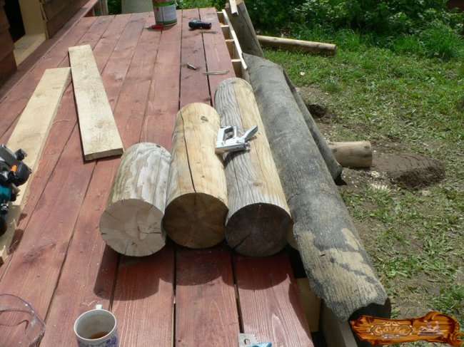 Бревна необходимо углубить на 25 см минимум. Обработайте бревно антисептиком. Оберните рубероидом. Закрепите опоры бетоном или камнем. Концы бревен тоже обработайте.