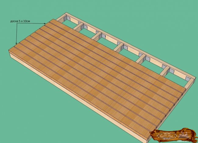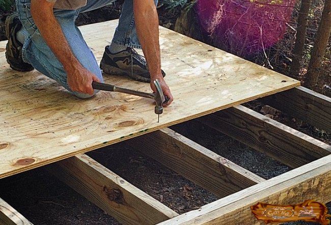 Расположите поперечные лаги, основу для пола. Закрепите их, соединив с опорами. Поперечные лаги должны быть приподняты над землей на 10 см, чтобы обеспечивать вентиляцию.