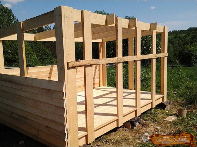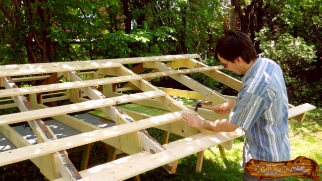 Установите 3 стропила на каркасе дровника, чтобы сделать крышу. Поперек расположите еще 5 бревен. Закрепите на каркасе кровлю. Используйте гвозди для шифера и рубероида. Саморезы применяют для крепления профнастила и ондулина.