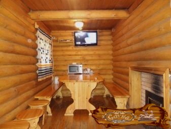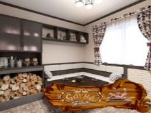 Если в бане оформляется отдельная комната для отдыхающих, то все внимание в дизайне на комфорт. На первом месте здесь все та же естественность. В оформлении уместны и шторки с воланами, и строгие жалюзи на окнах. Это помещение бани обычно компактное, но светлое.