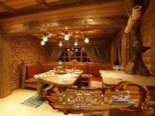 Комната отдыха в натуральном стиле. Ничего лишнего: лавки, стол, все из дерева. Здесь допустимо применение хвойных пород.