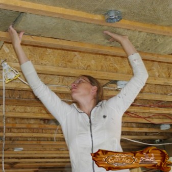 Работы, связанные с отделкой потолка, начинаются с укладки утеплителя на чердаке. Для исключения попадания пыли внутрь помещения все щели между досками надо замазать. В качестве материала утеплителя пользуются кирпичной крошкой, прочими сыпучими вариантами.