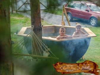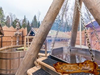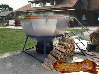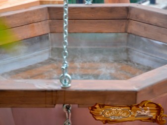 Такие банные чаны подвешиваются на цепях и крепятся к треногам, которые могут быть и металлическими, и деревянными. Опорами служат семиметровые бревна, так как они способны выдерживать вес чана. Этот вариант подходит для парения на свежем воздухе, ведь оно оказывает молодильный эффект, к тому же контраст весьма приятный, особенно если это зимнее время. Уличный привлекает многих, поэтому если есть свободное место на участке, то можно установить конструкцию, подогреть воду на костре и наслаждаться банными процедурами.