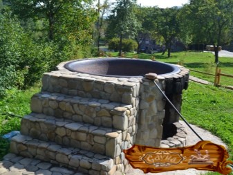 Такая конструкция монтируется на построенном постаменте, который сделан из профилированной трубы. В некоторых чанах он может закрываться и быть облицован декоративным материалом, который обладает пожаростойкостью. Зачастую это кирпич, терракотовая плитка или камень. Под конструкцией готовится место для очага либо встраивается печь, чтобы поддерживать температуру воды в емкости. По правилам она должна достигать 45 градусов по Цельсию, так как это наиболее комфортно в зимнее время.