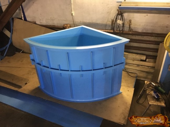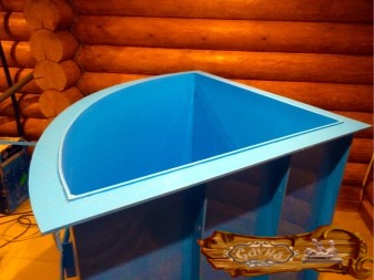 Еще одной разновидностью купелей является угловая форма данного изделия. Этот вариант лучше всего подходит для использования в помещении, так как нуждается в стенках-опорах, в отличие от других емкостей. Угловую купель стоит выбирать в том случае, если нет возможности разместить в помещении любые другие формы изделия. Несмотря на определенную экономию места, угловая конструкция имеет ряд недостатков.