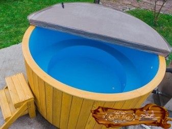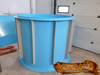 Среди разновидностей пластиковых емкостей для принятия водных процедур выделяют еще бочкообразную купель. Внешне она напоминает круглую и отличается меньшим диаметром, но большей глубиной. Зачастую такую конструкцию не углубляют в землю, а покрывают деревянными досками, что позволяет лучше сохранять температуру воды и сделать внешний вид емкости более эстетичным.