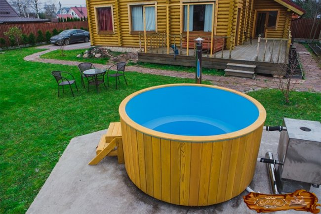 Чан из полиуретана обшитый деревянными рейками. Присутствует возможность подогрева. Красиво смотрится в саду на дачном участке.