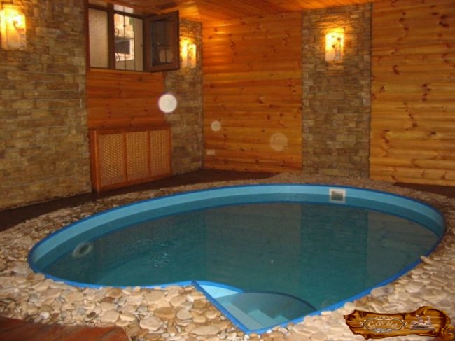 Ванная, погруженная в грунт внутри дома. Такая конструкция выглядит монументально, вызывает у владельца чувство гордости. Системы подачи, откачки воды, гидромассаж предусмотрены.
