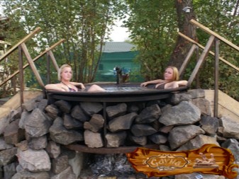 Погружная модель купели может быть установлена не только в пределах дома, но и на улице. Чтобы реализовать интересную идею, потребуется установить чан на прочную конструкцию, а вокруг соорудить кирпичную или каменную кладку.