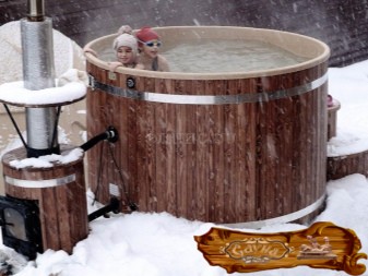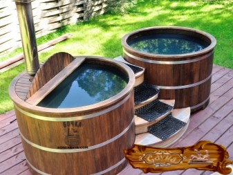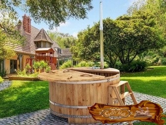 Но, если отсутствует необходимость использования всевозможных современных изысков, простую купель для периодического или повседневного купания, закаливания на свежем воздухе можно собрать собственноручно. Основным материалом для изготовления большой кадки будет дерево, а вспомогательным – металлические обручи, крепежи. Такой чан устанавливается во дворе частного дома, на даче и каждый раз позволяет наслаждаться водными процедурами на лоне природы.