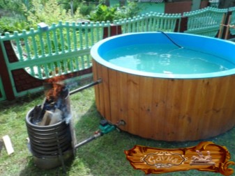 Металлический, чугунный чан с подогревом на дровах – наиболее простое решение вопроса при создании купели с печью для дачи с обогревом на открытом воздухе.