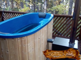 Одно из самых популярных решений – установка готовой чаши из полипропилена с внешней облицовкой из массива крепких древесных пород – лиственницы, дуба, кедра. Пластиковая бочка оснащена утеплением для стен, пола, сливной системой, гидромассажем, подсветкой, характерными приспособлениями для погружения и выхода из купели (поручни, лестница). Есть и печка для подогрева воды.
