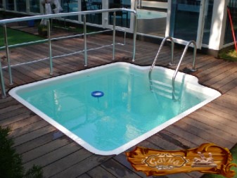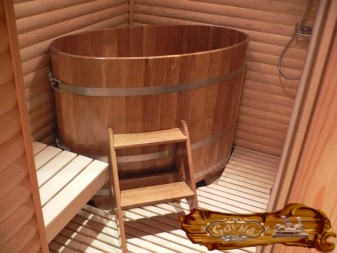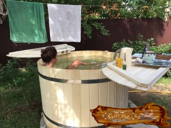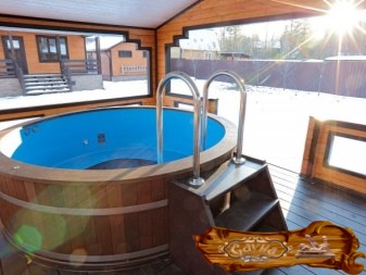 Продавец обязательно спросит, какой функциональности должно быть изделие. Самые дорогие модели предполагают наличие не только лавочек внутри и ступенек, но и системы слива воды, отопительных элементов, гидромассажа.