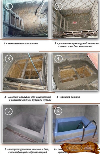 Перед тем как заливать бетон, сначала нужно установить арматуру, водопровод и канализационные трубы. Чтобы уменьшить потерю тепла, в качестве несъемной опалубки лучше всего взять экструдированный пенопласт, изготовленный в виде плит. В бане и на свежем воздухе монолитная конструкция углубляется в грунт. Если есть желание, то бетонную чашу поднимают над уровнем земли.