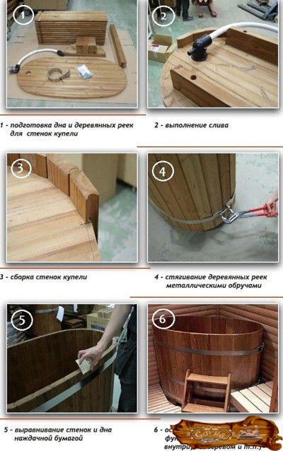 Перед тем как приступать к изготовлению деревянной чаши своими руками, потребуется сначала оценить свободное пространство. Только после этого можно сделать чертеж. Важно установить сливной сифон, учесть место подключения канализационных и водопроводных труб, наличие гидромассажа, лавочек и ступенек. Собирать изделие следует из древесных панелей, толщина которых может варьироваться от 3.5 см до 5 см.