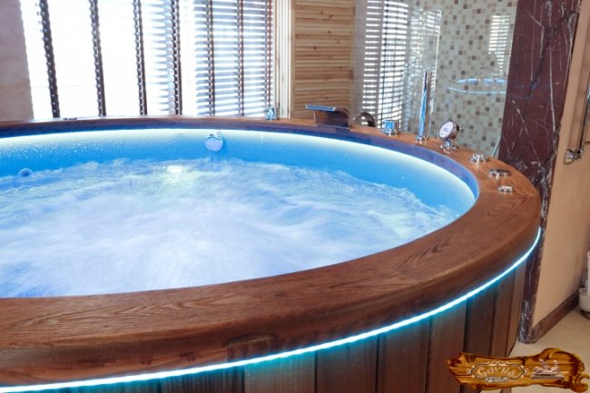 Описываемая конструкция выделяется удобством и, что не менее важно, долговечностью. Если изготавливает мастер, то он может соорудить мини-водопад или сделать эффект гидромассажа. Установленная светодиодная подсветка ночью всегда смотрится обворожительно.