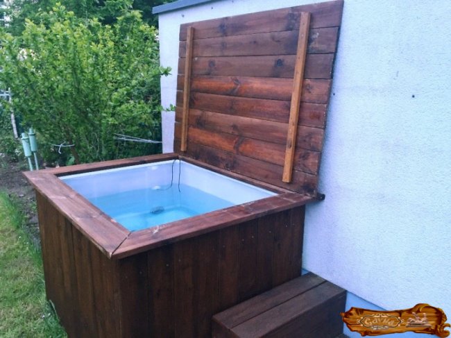 Открытые резервуары ставят как на улице, так и в помещении. К ним подводят воду и канализационные трубы. Чтобы построить такую купель не потребуется больших финансовых затрат. Уличные варианты советуют дополнять печкой.