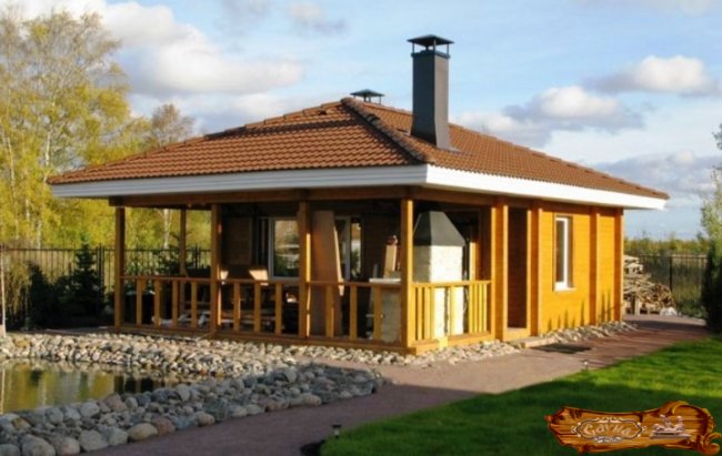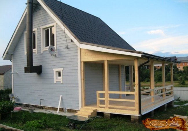 Данный вид пристройки – просторная площадка без остекления, которая по периметру оформляется невысоким ограждением. Терраса хорошо защищает парилку от осадков и ветра.