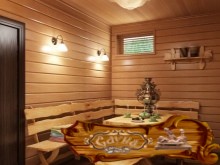 Не менее популярны также и проекты бань с комнатой отдыха, обустроенной купелью. Облицовка мини-бассейна выполняется плиткой, ее цвет и дизайн подбирается под стилистику комнаты отдыха. Пристройку рекомендуется оформить в восточном стиле, используя мозаику и цветочный орнамент, ее можно возвести как из дерева, так и из кирпича. Мебель выбирается из влагоустойчивых материалов.