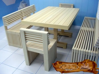 Из липы производят отличную мебель для бани. Это может быть шикарный и добротный стол, лавка, стулья/табуреты и даже уютный разборный лежак.