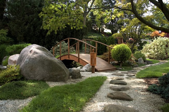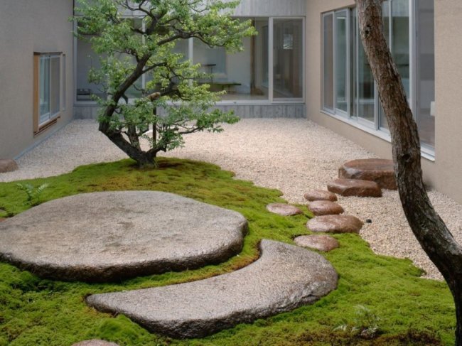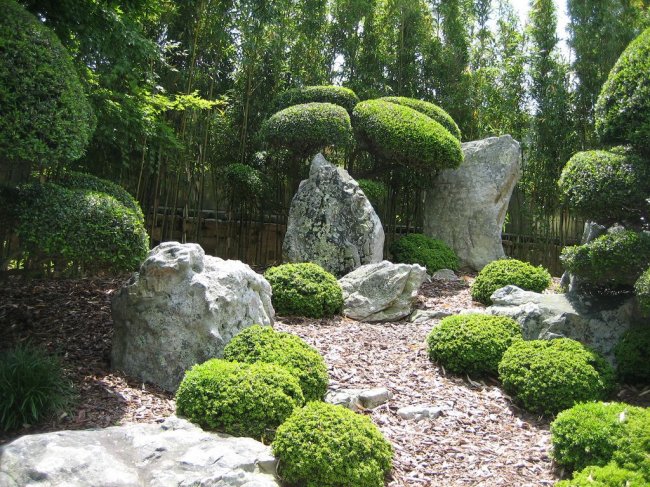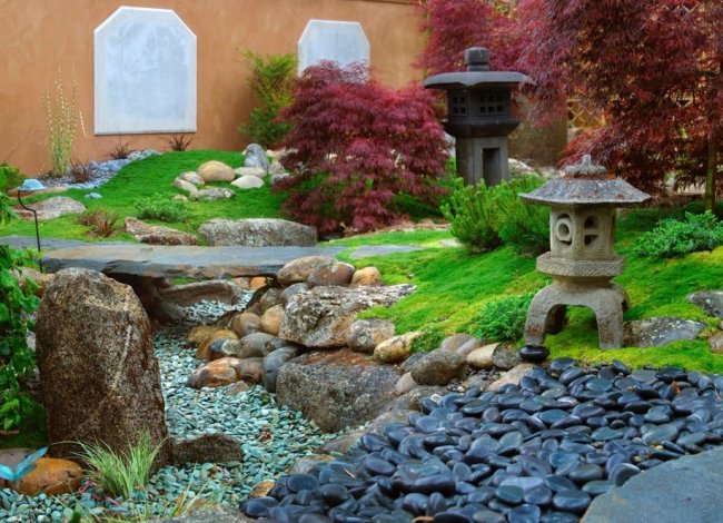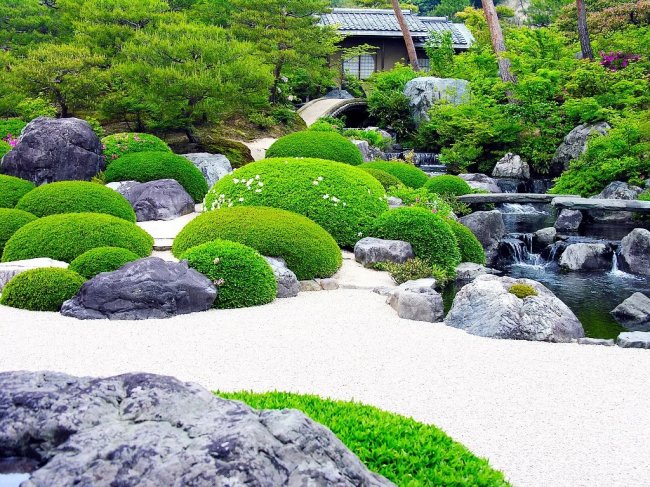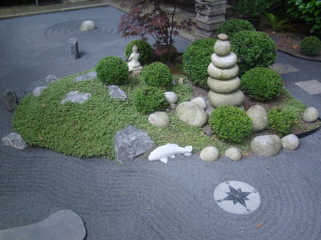 Японские сады камней всегда асимметричные, наполненные элементами разных размеров и форм. Декор никогда не размещается параллельно. Все объекты должны хорошо просматриваться под любым углом обзора и создавать семиугольную геометрическую сеть линий. При наличии на участке водоема, следует продумать эффект отражения камней в воде.