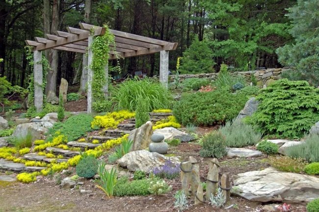 Любой рокарий, независимо от размера, должен располагаться максимально естественно, гармонировать с рельефом участка и прочими декоративными элементами. Неровности будут идеальной платформой для размещения композиции. Даже самую невзрачную впадину или холм можно превратить в оригинальный дизайнерский элемент. Если участок абсолютно ровный, перепады создаются искусственно различными способами.