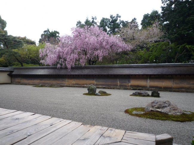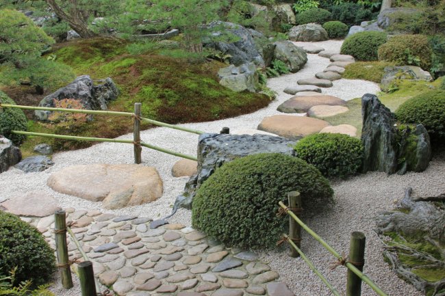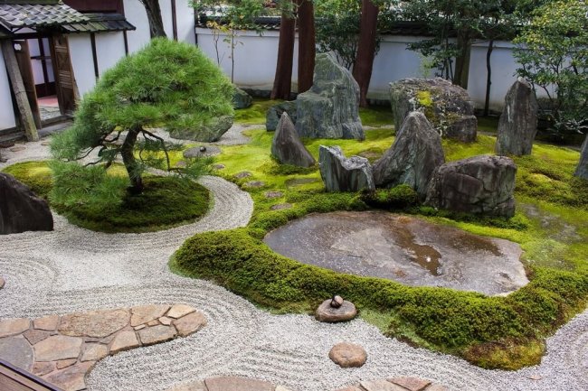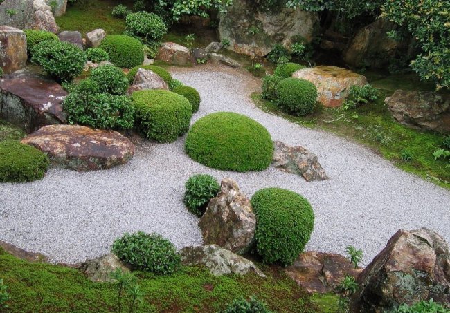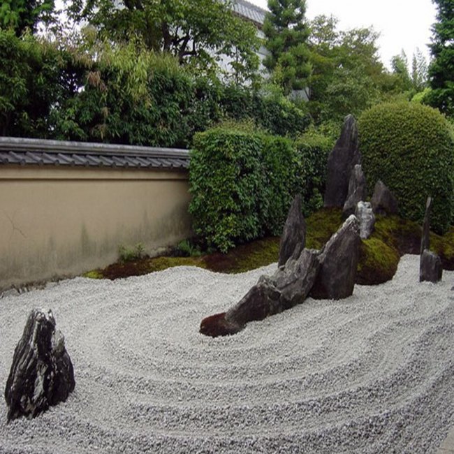 Одним из самых знаменитых садов камней считается большая композиция в Киото. Она представляет собой 15-ть камней на белом гравии, декорированных зеленым мхом. Уникальность композиции заключается в удивительном визуальном эффекте. С какой бы стороны на нее не взглянуть, один элемент всегда будет скрыт от просмотра. Согласно поверью, полностью увидеть сад сможет только просветленный и духовно очищенный человек.
