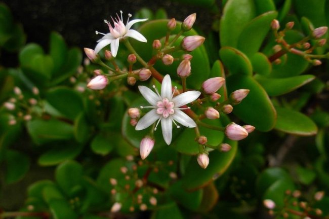 Увидеть денежное дерево, усыпанное белыми соцветиями, – большая удача. Это растение не часто радует цветом, поскольку медленно растет и требует специальных условий для появления бутонов. Если это событие произойдет, то владельца толстянки будут радовать маленькие белые цветочки, похожие на звездочки, завязавшиеся на некоторых или всех молодых побегах.