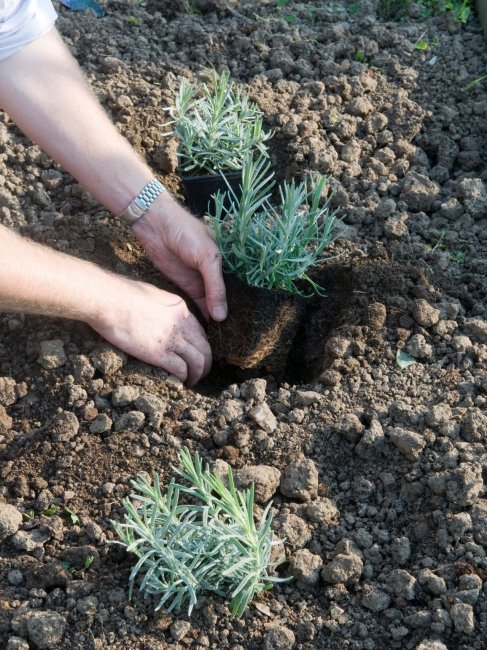 Перед посадкой куст ставят в воду на час или полтора. Потом срезают верхушку для лучшего кущения. Сильно торчащие нижние веточки и корни устраняют — это обязательно. Если в саду планируется грядка из досок, то их ширину подбирают до 40 см. Соответственно, она равна ограничению по высоте. Что касается глубины ямы для лаванды средних размеров, то ориентируются примерно на 30 см. Расстояние между ямами соседних кустиков подбирают на уровне 30 см — для маленьких, 120 см — для высоких. Лунки заполняют удобрением, а поверх него иногда добавляют слой сосновой коры или костной муки. Все это перемешивают с почвой. В случае проблем с дренажом — не помешает добавить немного гальки. Эти меры поспособствуют нормальному началу роста. Лаванду помещают в ямку, акцентировано прижимая к стенкам и дну. Корни не должны плотно соприкасаться с удобрением. В этом смысле как раз таки помогут слои выше.