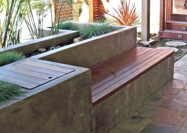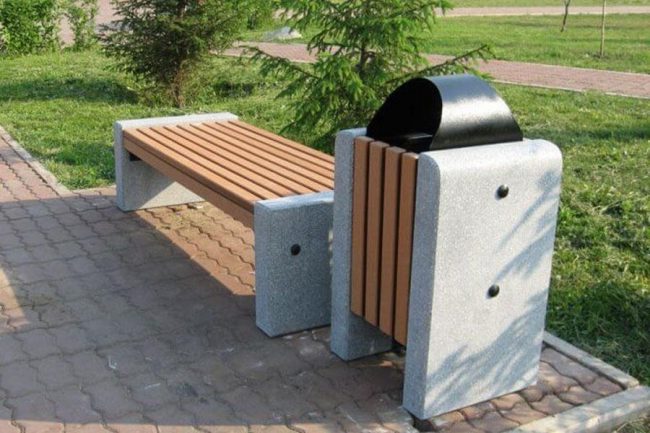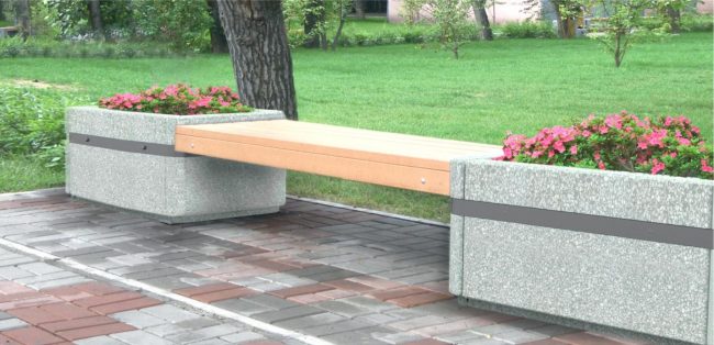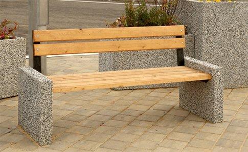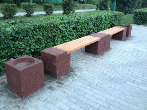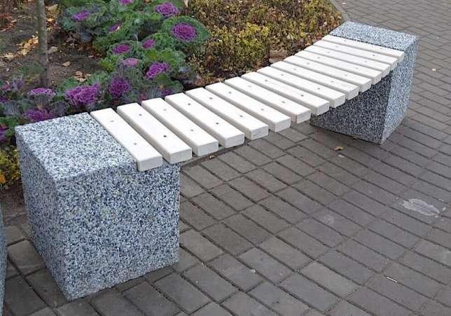 При изготовлении основы скамьи применяют стандартный плотный бетон, и смеси с включением разноцветной гранитной крошки, мрамора, щебня. Такие добавки придают фактурности основанию скамьи и позволяют разнообразить цветовую палитру.