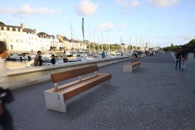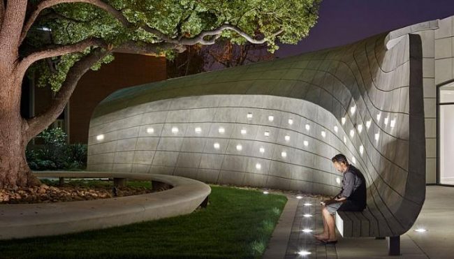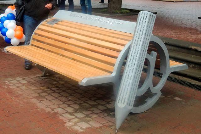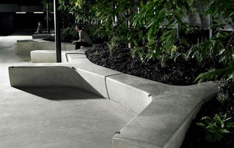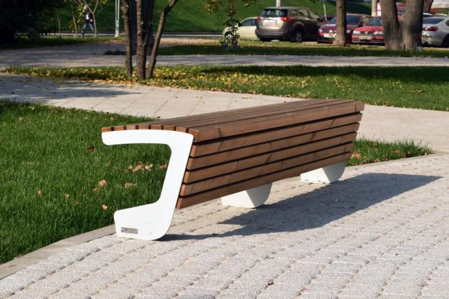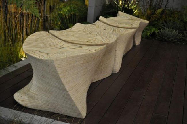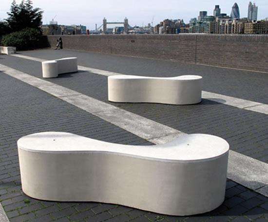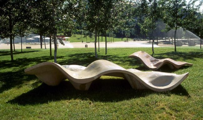 Пластичность материала позволяет дизайнерам разрабатывать самые неожиданные варианты скамеек: