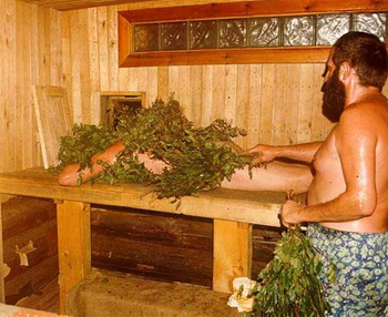 Если вам станет слишком горячо, скажите, тогда парильщик замедлит движение и поднимет руки вверх, потрясая над вами веником. Когда на теле появился пот, по нему опять можно пройтись энергично, размазывая пот веником.