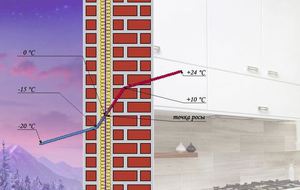 Точка росы не имеет постоянного места расположения в толще стены, она может перемещаться к наружному или внутреннему краю в зависимости от изменения температуры на улице или наличия отопления в доме. Если отопление стабильно держит постоянную температуру в нормативных пределах, но на улице похолодало, то точка будет смещена по толще ближе к внутреннему краю.