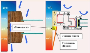 Иногда в зимний период при наступлении длительных морозных периодов точка росы смещается в сторону внутреннего пространства дома. Если стены выполняются из плотных материалов с низким показателем паропроницаемости, высоким сопротивлением теплопередаче, то опасности не возникает. Но в случае применения в качестве материала стен пористых материалов с высоким порогом проницаемости, особенно при сочетании с подобными утеплителями следует стремиться к тому, чтобы граница конденсата смещалась внутрь лишь на короткий промежуток времени.