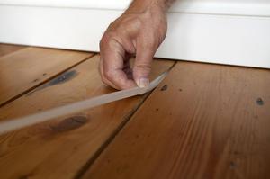 Сухой воздух. Если в помещении пересушенный воздух, то убирать щели на деревянном полу не нужно. Стянутые тесно доски через некоторое время пойдут «волнами». Проверить влажность воздуха можно с помощью гигрометра.