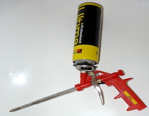 Пистолет с монтажной пеной. Использовав монтажную пену, можно заделать зазоры и заодно создать дополнительную теплоизоляцию. Работы с пистолетом необходимо проводить быстро, поскольку пена застывает буквально на глазах. Пистолет предварительно регулируется на слабую подачу.
