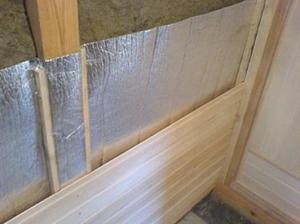 Чтобы фольга хорошо держалась на поверхности, нужно перед укладкой прибыть к стене парной деревянные бруски сечением 40 x 40 мм. Их следует располагать в горизонтальной плоскости.